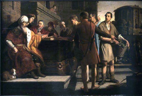 Assis sur une estrade de pierre qui délimite l’espace restreint de la scène, le propriétaire de la vigne est vêtu d’un costume oriental. Un chien est couché à ses pieds. Au fond à droite, le temple rond est inspiré de celui de Vesta à Rome, que l’artiste avait pu voir lors de son séjour en Italie. L’espace vague, ouvert, où s’élève le temple, s’oppose à l’espace fermé de la scène proprement dite, dont le décor de fond est une maison de brique et de pierre, au balcon de laquelle est accoudé un personnage. Il épie la scène, la surprend par effaction, métaphorisant ainsi le regard du spectateur.