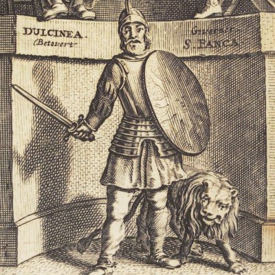 Don Quichotte, représenté en chevalier au lion, brandit son épée et un bouclier décoré d’un soleil. Il se tient dans un hémicycle au-dessus duquel Dulcinée, transformée en vieille paysanne, est assise à gauche, et Sancho à droite, siège en gouverneur de Barataria. Entre eux et les surmontant, le portrait de Merlin.