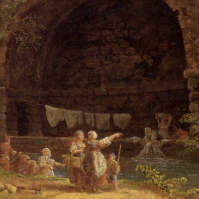 L’espace de la toile se divise en trois niveaux : en bas le bassin d’agrément a été transformé en lavoir et colonisé par les lavandières avec leurs enfants. Au milieu, le jardin en terrasse barre la composition en diagonale, avec sa balustrade à demi détruite, réparée à certains endroits par une rembarde de bois. En haut et sur la gauche les loges sont ouvertes avec de grandes arcades intercalées de pilastres qui devaient être à l’origine surmontés de statues : une seule a subsisté avec un tronçon de balustrade.