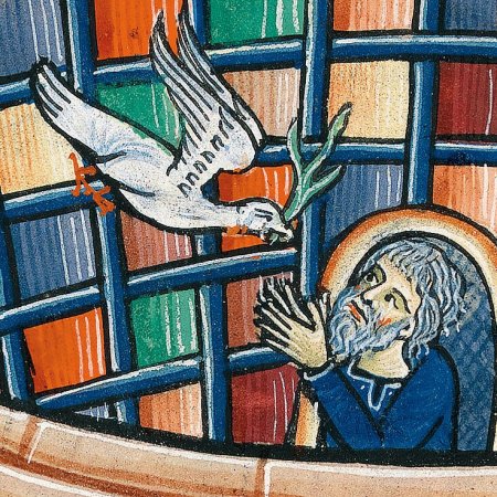 Noé lâche un corbeau. Retour de la colombe annonçant la fin du Déluge (Bible d’Utrecht, KB 78D39, F14r) Voir la série