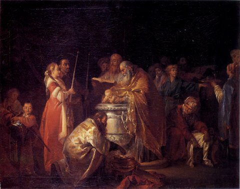« Le Baptême russe. Du même. Nous y voilà. Ma foi, c’est une belle cérémonie. Cette grande cuve baptismale d’argent fait un bel effet. La fonction de ces trois prêtres qui sont tous les trois à droite, debout, a de la dignité : le premier embrasse le nouveau-né par-dessous les bras et le plonge par les pieds dans la cuve ; le second tient le Rituel et lit les prières sacramentelles, il lit bien, comme un vieillard doit lire, en éloignant le livre de ses yeux ; le troisième regarde attentivement sur le livre ; et ce quatrième qui répand des parfums sur une poêle ardente placée vers la cuve baptismale, ne remarquez-vous pas comme il est bien, richement et noblement vêtu ? comme son action est naturelle et vraie ? Vous conviendrez que voilà quatre tête bien vénérables… » (DPV XIV 236.)