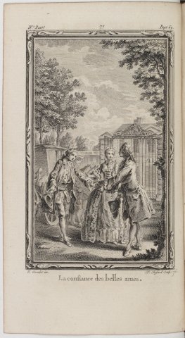 Car la théâtralisation scopique de la rencontre entre Julie et Saint-Preux n’est pas l’enjeu réel de cette lettre VI, malgré la gravure que Rousseau lui-même a prévue sous le titre « La confiance des belles âmes ». Rousseau travaille bien à partir d’un modèle scénique, dont il dispose soigneusement les jalons ; mais c’est pour mieux en décevoir les attentes.