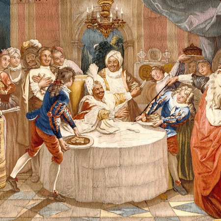 Les scènes de Coypel ont été tissées dans différents décors, conçus à partir de 1760. Le tissage a été dirigé aux Gobelins par Michel, Jean et Gérard Audran…